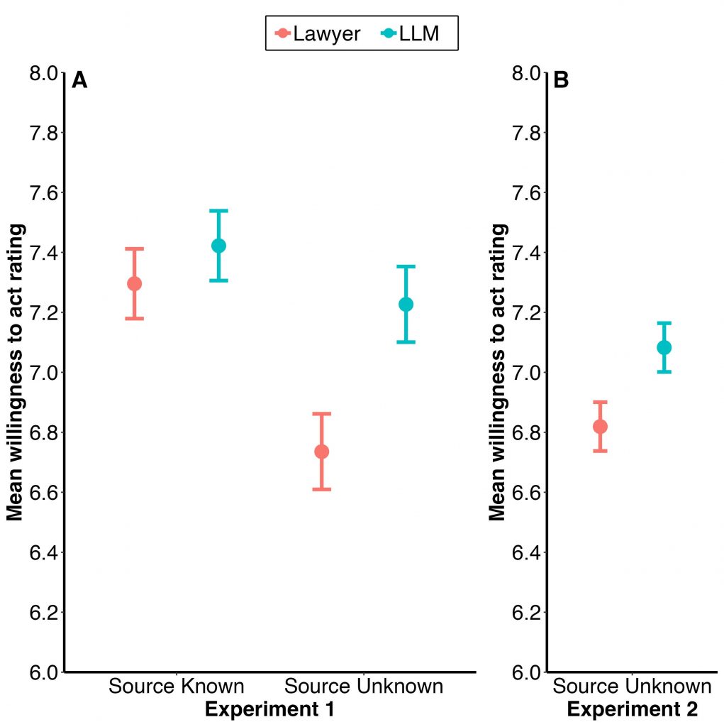What if you present legal advice from either a human expert or AI? Turns out in one study with replication: the AI presentation was trusted more frequently.