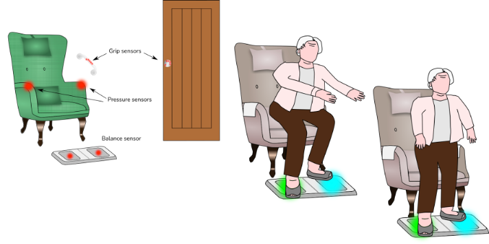 APPROACH: Once again, we are looking to an INCIDENTAL approach. So, to help build strength and balance we are leveraging what people are doing already AS strength moves – movements like sit/stand/push/grab/pull . The technologies we’ve build to explore supporting this practice foregrounds novel “unwearables” – unobtrusive sensors and devices that support remiders and guides for these actions.