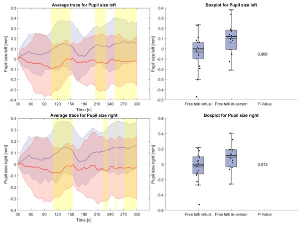 Graphs show pupil size differences between in person (larger) and online dialogic interactions. Pupil size is related to arousal – which affects attributes like engagement, attention, trust.